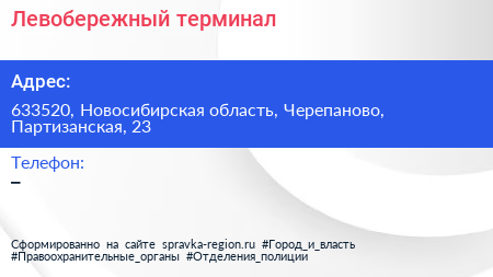 Левобережный, терминал по адресу 633520, Новосибирская область, Черепаново, Партизанская, 23 в дальнейшем Организация, размещена в следующих категориях: