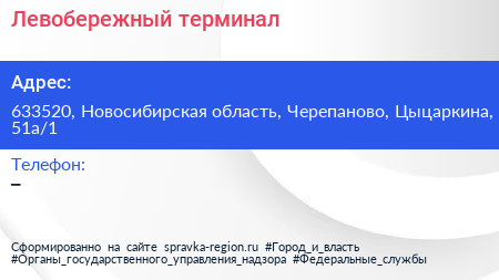 Левобережный, терминал по адресу 633520, Новосибирская область, Черепаново, Цыцаркина, 51а/1 в дальнейшем Организация, размещена в следующих категориях:
