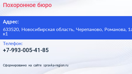 Похоронное бюро по адресу 633520, Новосибирская область, Черепаново, Романова, 1а к1 в дальнейшем Организация, размещена в следующих категориях: