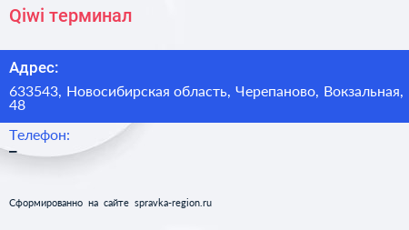Qiwi, терминал по адресу 633543, Новосибирская область, Черепаново, Вокзальная, 48 в дальнейшем Организация, размещена в следующих категориях: