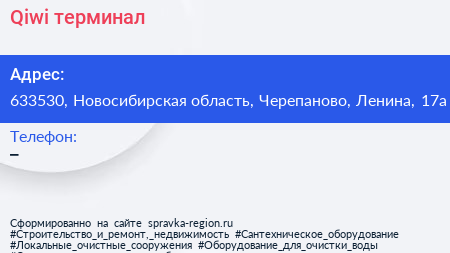 Qiwi, терминал по адресу 633530, Новосибирская область, Черепаново, Ленина, 17а в дальнейшем Организация, размещена в следующих категориях: