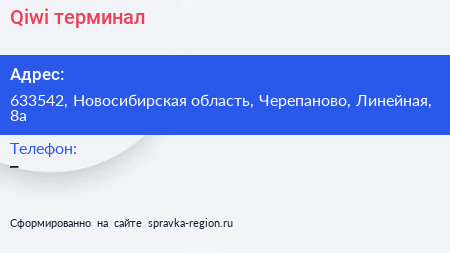 Qiwi, терминал по адресу 633542, Новосибирская область, Черепаново, Линейная, 8а в дальнейшем Организация, размещена в следующих категориях: