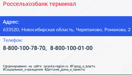 Россельхозбанк, терминал по адресу 633520, Новосибирская область, Черепаново, Романова, 2 в дальнейшем Организация, размещена в следующих категориях:
