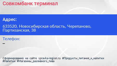 Совкомбанк, терминал по адресу 633520, Новосибирская область, Черепаново, Партизанская, 38 в дальнейшем Организация, размещена в следующих категориях: