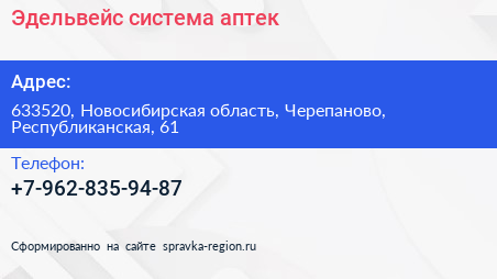 Эдельвейс, система аптек по адресу 633520, Новосибирская область, Черепаново, Республиканская, 61 в дальнейшем Организация, размещена в следующих категориях: