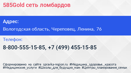 585Gold, сеть ломбардов по адресу Вологодская область, Череповец, Ленина, 76 в дальнейшем Организация, размещена в следующих категориях: