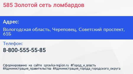 585*Золотой, сеть ломбардов по адресу Вологодская область, Череповец, Советский проспект, 61Б в дальнейшем Организация, размещена в следующих категориях: