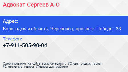 Адвокат Сергеев А.О. по адресу Вологодская область, Череповец, проспект Победы, 33 в дальнейшем Организация, размещена в следующих категориях: