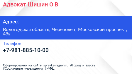 Адвокат Шишин О.В. по адресу Вологодская область, Череповец, Московский проспект, 49а в дальнейшем Организация, размещена в следующих категориях: