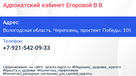 Адвокатский кабинет Егоровой В.В. по адресу Вологодская область, Череповец, проспект Победы, 105 в дальнейшем Организация, размещена в следующих категориях: