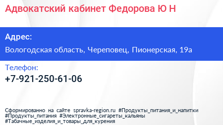 Адвокатский кабинет Федорова Ю.Н. по адресу Вологодская область, Череповец, Пионерская, 19а в дальнейшем Организация, размещена в следующих категориях: