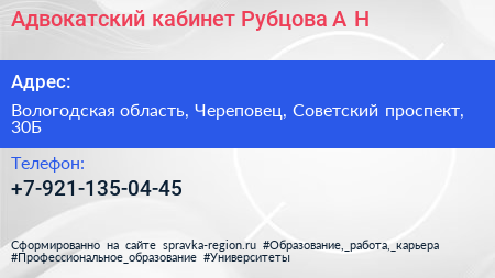 Адвокатский кабинет Рубцова А.Н. по адресу Вологодская область, Череповец, Советский проспект, 30Б в дальнейшем Организация, размещена в следующих категориях: