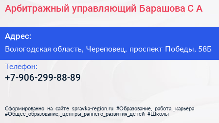 Арбитражный управляющий Барашова С.А. по адресу Вологодская область, Череповец, проспект Победы, 58Б в дальнейшем Организация, размещена в следующих категориях:
