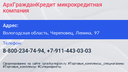 АрхГражданКредит, микрокредитная компания по адресу Вологодская область, Череповец, Ленина, 97 в дальнейшем Организация, размещена в следующих категориях: