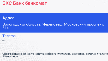 БКС Банк, банкомат по адресу Вологодская область, Череповец, Московский проспект, 51а в дальнейшем Организация, размещена в следующих категориях: