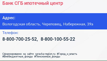 Банк СГБ, ипотечный центр по адресу Вологодская область, Череповец, Набережная, 39а в дальнейшем Организация, размещена в следующих категориях: