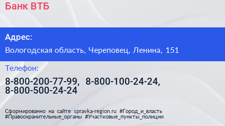 Банк ВТБ по адресу Вологодская область, Череповец, Ленина, 151 в дальнейшем Организация, размещена в следующих категориях:
