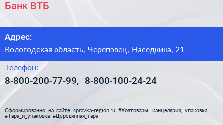 Банк ВТБ по адресу Вологодская область, Череповец, Наседкина, 21 в дальнейшем Организация, размещена в следующих категориях:
