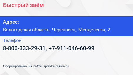 Быстрый заём по адресу Вологодская область, Череповец, Менделеева, 2 в дальнейшем Организация, размещена в следующих категориях: