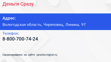 Деньги Сразу по адресу Вологодская область, Череповец, Ленина, 97 в дальнейшем Организация, размещена в следующих категориях: