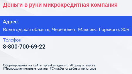 Деньги в руки, микрокредитная компания по адресу Вологодская область, Череповец, Максима Горького, 30Б в дальнейшем Организация, размещена в следующих категориях: