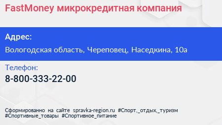 FastMoney, микрокредитная компания по адресу Вологодская область, Череповец, Наседкина, 10а в дальнейшем Организация, размещена в следующих категориях: