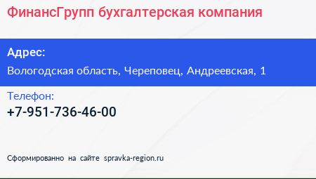 ФинансГрупп, бухгалтерская компания по адресу Вологодская область, Череповец, Андреевская, 1 в дальнейшем Организация, размещена в следующих категориях: