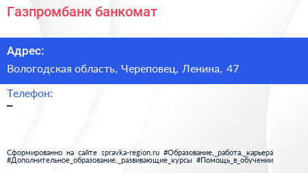 Газпромбанк, банкомат по адресу Вологодская область, Череповец, Ленина, 47 в дальнейшем Организация, размещена в следующих категориях: