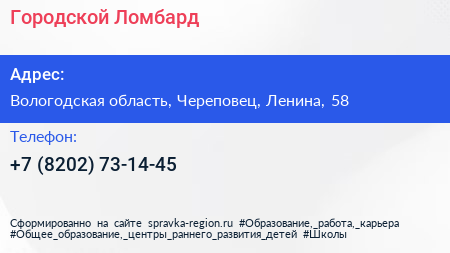 Городской Ломбард по адресу Вологодская область, Череповец, Ленина, 58 в дальнейшем Организация, размещена в следующих категориях: