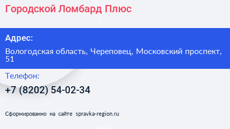 Городской Ломбард Плюс по адресу Вологодская область, Череповец, Московский проспект, 51 в дальнейшем Организация, размещена в следующих категориях: