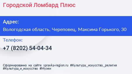 Городской Ломбард Плюс по адресу Вологодская область, Череповец, Максима Горького, 30 в дальнейшем Организация, размещена в следующих категориях: