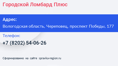 Городской Ломбард Плюс по адресу Вологодская область, Череповец, проспект Победы, 177 в дальнейшем Организация, размещена в следующих категориях: