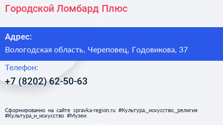 Городской Ломбард Плюс по адресу Вологодская область, Череповец, Годовикова, 37 в дальнейшем Организация, размещена в следующих категориях: