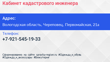 Кабинет кадастрового инженера по адресу Вологодская область, Череповец, Первомайская, 21а в дальнейшем Организация, размещена в следующих категориях: