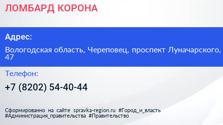 ЛОМБАРД КОРОНА по адресу Вологодская область, Череповец, проспект Луначарского, 47 в дальнейшем Организация, размещена в следующих категориях: