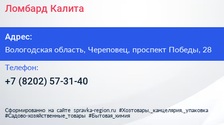 Ломбард Калита по адресу Вологодская область, Череповец, проспект Победы, 28 в дальнейшем Организация, размещена в следующих категориях: