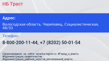НБ Траст по адресу Вологодская область, Череповец, Социалистическая, 48/33 в дальнейшем Организация, размещена в следующих категориях: