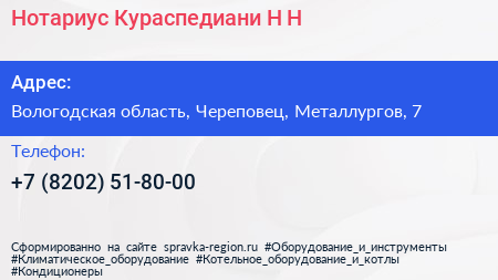 Нотариус Кураспедиани Н.Н. по адресу Вологодская область, Череповец, Металлургов, 7 в дальнейшем Организация, размещена в следующих категориях: