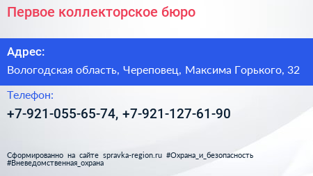 Первое коллекторское бюро по адресу Вологодская область, Череповец, Максима Горького, 32 в дальнейшем Организация, размещена в следующих категориях: