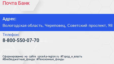 Почта Банк по адресу Вологодская область, Череповец, Советский проспект, 98 в дальнейшем Организация, размещена в следующих категориях: