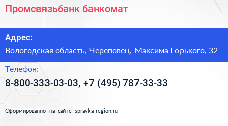 Промсвязьбанк, банкомат по адресу Вологодская область, Череповец, Максима Горького, 32 в дальнейшем Организация, размещена в следующих категориях: