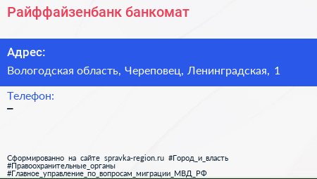 Райффайзенбанк, банкомат по адресу Вологодская область, Череповец, Ленинградская, 1 в дальнейшем Организация, размещена в следующих категориях: