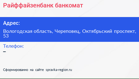 Райффайзенбанк, банкомат по адресу Вологодская область, Череповец, Октябрьский проспект, 53 в дальнейшем Организация, размещена в следующих категориях: