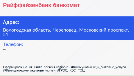 Райффайзенбанк, банкомат по адресу Вологодская область, Череповец, Московский проспект, 51 в дальнейшем Организация, размещена в следующих категориях: