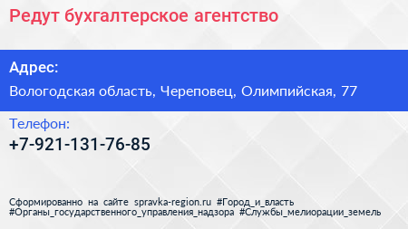 Редут, бухгалтерское агентство по адресу Вологодская область, Череповец, Олимпийская, 77 в дальнейшем Организация, размещена в следующих категориях: