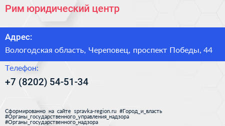 Рим, юридический центр по адресу Вологодская область, Череповец, проспект Победы, 44 в дальнейшем Организация, размещена в следующих категориях: