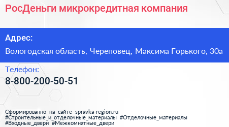 РосДеньги, микрокредитная компания по адресу Вологодская область, Череповец, Максима Горького, 30а в дальнейшем Организация, размещена в следующих категориях: