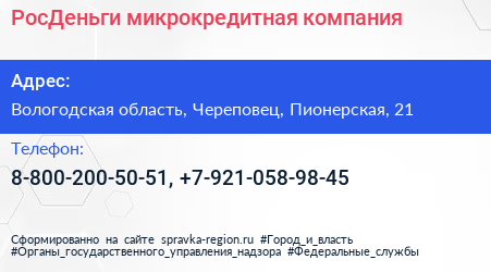РосДеньги, микрокредитная компания по адресу Вологодская область, Череповец, Пионерская, 21 в дальнейшем Организация, размещена в следующих категориях: