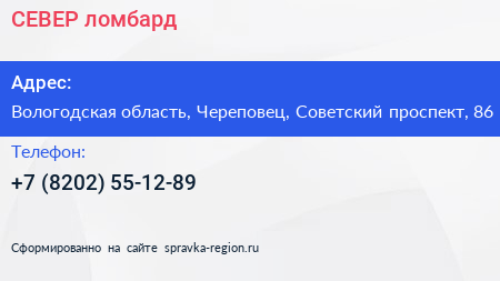 СЕВЕР, ломбард по адресу Вологодская область, Череповец, Советский проспект, 86 в дальнейшем Организация, размещена в следующих категориях: