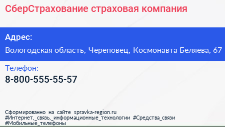 СберСтрахование, страховая компания по адресу Вологодская область, Череповец, Космонавта Беляева, 67 в дальнейшем Организация, размещена в следующих категориях: